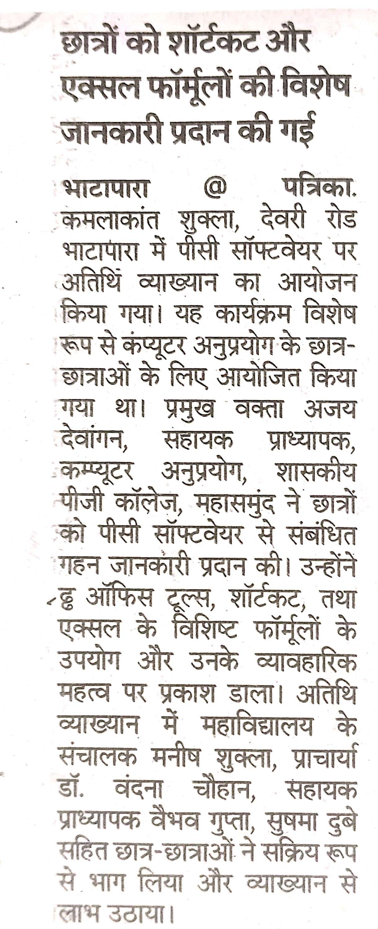 दिनाँक 14/04/2026 को डॉ भीमराव अंबेडकर जयंती के अवसर पर अवकाश रहेगा | | प्री.बी.एड. (Pre.B.Ed.26) प्रवेश परीक्षा - 2026 | दिनाँक 03 /04/2026 को गुड फ्राइडे के अवसर पर अवकाश रहेगा | दिनाँक 31 /03/2026 को महावीर जयंती के अवसर पर अवकाश रहेगा | दिनाँक 26 /03 /2026 को रामनवमी के अवसर पर अवकाश रहेगा | दिनाँक 21 /03 /2026 को ईदुलफ़ितर के अवसर पर अवकाश रहेगा | AI in Health Care पर दो दिन वर्कशॉप दिनांक 18-मार्च-2026 से 19 मार्च 2026 तक | अतिथि व्याख्यान (विज्ञान विभाग) दिनांक 12 /03/2026 नाभीक | अतिथि व्याख्यान (विज्ञान विभाग) दिनांक 11/03/2026 विषय - परामर्श एवं निर्देशन ( कैरियर गाइडेंस) | अंतरराष्ट्रीय महिला दिवस प्रोग्राम दिनांक 08-03-2026 | विशाखापट्टनम शैक्षणिक भ्रमण दिनांक 28-02-2023 से 01-03-2026 | Employability Skills Development Program Date 19-02-2026 To 25-02-2026 | वार्षिकोत्सव "सुषिर" दिनांक 05-02-2026 | राज्य स्तरीय राष्ट्रीय युवा दिवस बलौदा बाजार मे आयोजित दिनांक 12/01/2026 | राष्ट्रीय युवा दिवस के अवसर पर महाविद्यालय मे मैराथन दौड़ दिनांक 12/01/2025 | दिनाँक 03/01/2026 को छेरछेरा के अवसर पर अवकाश रहेगा | तीन दिवसीय कार्यशाला(कम्प्यूटर हार्डवेयर मेन्टेनेस ) का आयोजन दिनांक 29 दिसम्बर 2025 से 31 दिसम्बर 2025 तक आयोजित है | दिनाँक 25/12/2025 से दिनाँक 28/12/2025 तक शीतकालीन के अवसर पर अवकाश रहेगा | दिनाँक 18/12/2025 को गुरु घासीदास जयंती के अवसर पर अवकाश रहेगा | बी.ए. , बी. एस. सी. एवं बी. कॉम ' फाइनल वर्ष की अर्द्धवार्षिक परीक्षा 11/12/2025 से | बी. एड. प्रथम सेमेस्टर के छात्र - छात्राओ को शाला अनुभव प्रशिक्षण मे दिनांक 11/12/2025 से 15/01/2026 तक जाना है | दिनाँक 10/12/2025 को शहीद वीर नारायण सिंह बलिदान दिवस के अवसर पर अवकाश रहेगा | दिनाँक 08/12/2025 को ग्राम देवरी ओर दिनाँक 09/12/2025 को ग्राम तरेंगा एवं सिंगारपुर मे सामुदायिक कार्यक्रम आयोजित की जावेगी | फ्रेशर्स पार्टी शिक्षा संकाय दिनांक 06-12-2025 | DCA प्रथम सेमेस्टर के प्रायोगिक परीक्षा दिनाँक 6-12-2025 को प्रातः 11-00 बजे आयोजित होगी | PGDCA प्रथम सेमेस्टर के 104 Practical Based on PGDCA 102 की प्रायोगिक परीक्षा दिनाँक 06-12-2025 को प्रातः 12-00 बजे आयोजित होगी | 1 दिसंबर 2025 को एड्स दिवस के अवसर पर रेड क्रॉस सोसायटी द्वारा जागरुकता कार्यक्रम आयोजित की जावेगी | जिला विधिक सेवा प्राधिकरण बलौदा बाजार द्वारा - कार्यक्षेत्र पर महिलाओ के साथ होने वाले उत्पीड़न पर जागरुकता कार्यक्रम दिनाँक 28 -11-2025 दोपहर 1 बजे आयोजित होगी | PGDCA प्रथम सेमेस्टर के 105 Practical Based on PGDCA 103 की प्रायोगिक परीक्षा दिनाँक 01-12-2025 को प्रातः 09-00 बजे आयोजित होगी | चार दिवसीय हार्टफूलनेस , तनाव प्रबंधन एवं स्वास्थ्य जीवन शैली पर कार्यशाला दिनाँक 26-11-2025 से 29-11-2025 तक आयोजित की जावेगी | | स्मार्ट लाइब्रेरी : एक नई दिशा की ओर पर अतिथि व्याख्यान का आयोजन दिनाँक 25-11-2025 दिन मंगलवार को | लाइब्रेरी मे बुक बाइंडिंग प्रोग्राम 20/11/2025 को आयोजित की जावेगी | महाविद्यालय मे आनंद मेला का आयोजन दिनाँक 22-11-202
