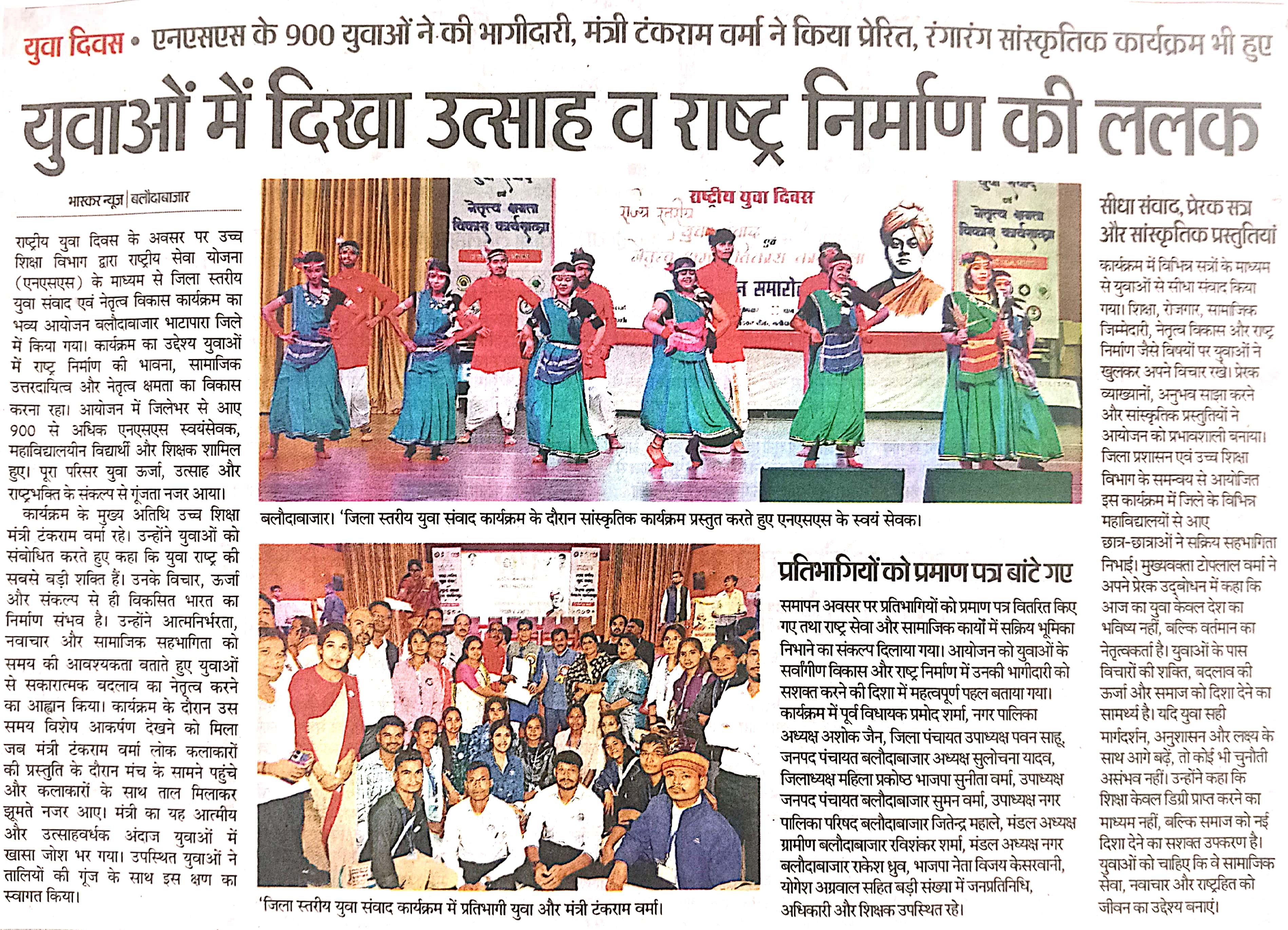 दिनाँक 14/04/2026 को डॉ भीमराव अंबेडकर जयंती के अवसर पर अवकाश रहेगा | | प्री.बी.एड. (Pre.B.Ed.26) प्रवेश परीक्षा - 2026 | दिनाँक 03 /04/2026 को गुड फ्राइडे के अवसर पर अवकाश रहेगा | दिनाँक 31 /03/2026 को महावीर जयंती के अवसर पर अवकाश रहेगा | दिनाँक 26 /03 /2026 को रामनवमी के अवसर पर अवकाश रहेगा | दिनाँक 21 /03 /2026 को ईदुलफ़ितर के अवसर पर अवकाश रहेगा | AI in Health Care पर दो दिन वर्कशॉप दिनांक 18-मार्च-2026 से 19 मार्च 2026 तक | अतिथि व्याख्यान (विज्ञान विभाग) दिनांक 12 /03/2026 नाभीक | अतिथि व्याख्यान (विज्ञान विभाग) दिनांक 11/03/2026 विषय - परामर्श एवं निर्देशन ( कैरियर गाइडेंस) | अंतरराष्ट्रीय महिला दिवस प्रोग्राम दिनांक 08-03-2026 | विशाखापट्टनम शैक्षणिक भ्रमण दिनांक 28-02-2023 से 01-03-2026 | Employability Skills Development Program Date 19-02-2026 To 25-02-2026 | वार्षिकोत्सव "सुषिर" दिनांक 05-02-2026 | राज्य स्तरीय राष्ट्रीय युवा दिवस बलौदा बाजार मे आयोजित दिनांक 12/01/2026 | राष्ट्रीय युवा दिवस के अवसर पर महाविद्यालय मे मैराथन दौड़ दिनांक 12/01/2025 | दिनाँक 03/01/2026 को छेरछेरा के अवसर पर अवकाश रहेगा | तीन दिवसीय कार्यशाला(कम्प्यूटर हार्डवेयर मेन्टेनेस ) का आयोजन दिनांक 29 दिसम्बर 2025 से 31 दिसम्बर 2025 तक आयोजित है | दिनाँक 25/12/2025 से दिनाँक 28/12/2025 तक शीतकालीन के अवसर पर अवकाश रहेगा | दिनाँक 18/12/2025 को गुरु घासीदास जयंती के अवसर पर अवकाश रहेगा | बी.ए. , बी. एस. सी. एवं बी. कॉम ' फाइनल वर्ष की अर्द्धवार्षिक परीक्षा 11/12/2025 से | बी. एड. प्रथम सेमेस्टर के छात्र - छात्राओ को शाला अनुभव प्रशिक्षण मे दिनांक 11/12/2025 से 15/01/2026 तक जाना है | दिनाँक 10/12/2025 को शहीद वीर नारायण सिंह बलिदान दिवस के अवसर पर अवकाश रहेगा | दिनाँक 08/12/2025 को ग्राम देवरी ओर दिनाँक 09/12/2025 को ग्राम तरेंगा एवं सिंगारपुर मे सामुदायिक कार्यक्रम आयोजित की जावेगी | फ्रेशर्स पार्टी शिक्षा संकाय दिनांक 06-12-2025 | DCA प्रथम सेमेस्टर के प्रायोगिक परीक्षा दिनाँक 6-12-2025 को प्रातः 11-00 बजे आयोजित होगी | PGDCA प्रथम सेमेस्टर के 104 Practical Based on PGDCA 102 की प्रायोगिक परीक्षा दिनाँक 06-12-2025 को प्रातः 12-00 बजे आयोजित होगी | 1 दिसंबर 2025 को एड्स दिवस के अवसर पर रेड क्रॉस सोसायटी द्वारा जागरुकता कार्यक्रम आयोजित की जावेगी | जिला विधिक सेवा प्राधिकरण बलौदा बाजार द्वारा - कार्यक्षेत्र पर महिलाओ के साथ होने वाले उत्पीड़न पर जागरुकता कार्यक्रम दिनाँक 28 -11-2025 दोपहर 1 बजे आयोजित होगी | PGDCA प्रथम सेमेस्टर के 105 Practical Based on PGDCA 103 की प्रायोगिक परीक्षा दिनाँक 01-12-2025 को प्रातः 09-00 बजे आयोजित होगी | चार दिवसीय हार्टफूलनेस , तनाव प्रबंधन एवं स्वास्थ्य जीवन शैली पर कार्यशाला दिनाँक 26-11-2025 से 29-11-2025 तक आयोजित की जावेगी | | स्मार्ट लाइब्रेरी : एक नई दिशा की ओर पर अतिथि व्याख्यान का आयोजन दिनाँक 25-11-2025 दिन मंगलवार को | लाइब्रेरी मे बुक बाइंडिंग प्रोग्राम 20/11/2025 को आयोजित की जावेगी | महाविद्यालय मे आनंद मेला का आयोजन दिनाँक 22-11-202