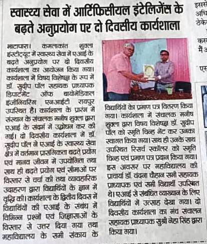 AI in Health Care पर दो दिवसीय वर्कशॉप दिनांक 18-मार्च-2026 से 19 मार्च 2026